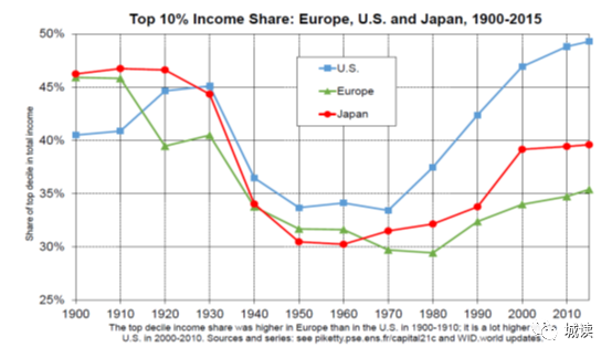 在最新出版的《資本與意識(shí)形態(tài)》一書中,法國著名經(jīng)濟(jì)學(xué)家托馬斯·皮凱蒂描繪了前10%的高收入占比變動(dòng)情況。