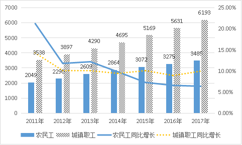 數(shù)據(jù)來源:根據(jù)《2011—2017年度人力資源和社會(huì)保障事業(yè)發(fā)展統(tǒng)計(jì)公報(bào)》《2011—2017國家統(tǒng)計(jì)局農(nóng)民工監(jiān)測(cè)調(diào)查報(bào)告》整理