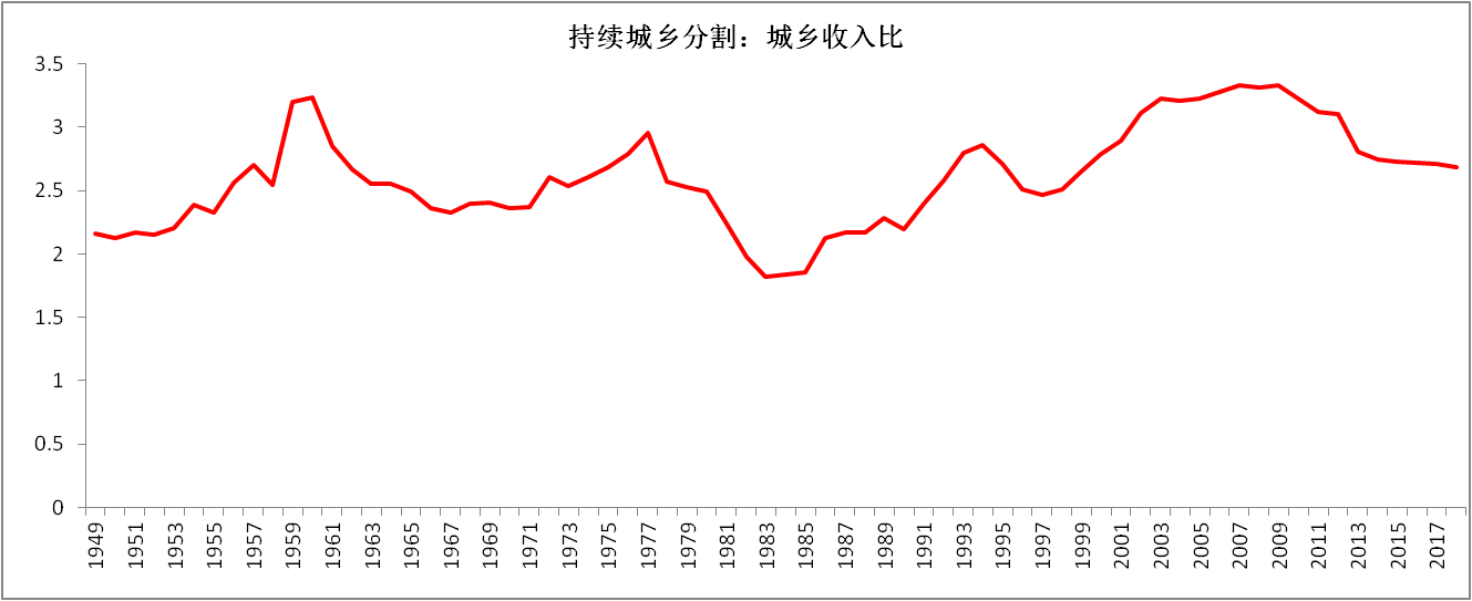 資料來源:其中1949-1956年城鄉(xiāng)居民收入數(shù)據(jù)來自于消費(fèi)數(shù)據(jù),1957-1977年數(shù)據(jù)來自于《新中國六十年年統(tǒng)計(jì)資料匯編》,1978-2018年數(shù)據(jù)來自于《中國統(tǒng)計(jì)鑒》。