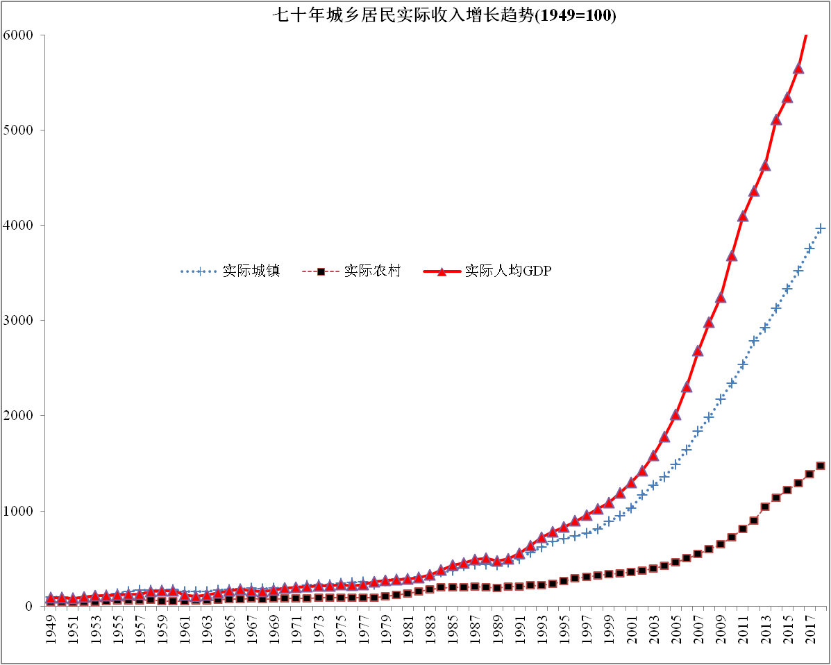 圖5:70年來城鄉(xiāng)居民實(shí)際收入增長趨勢(shì)
