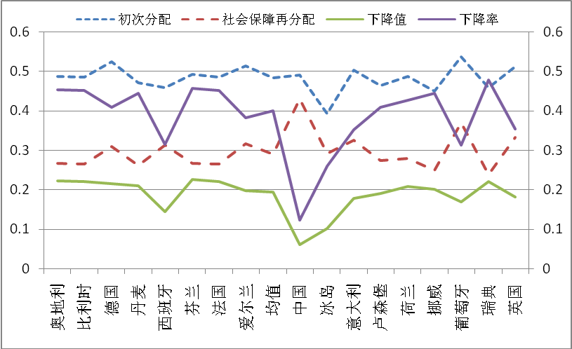 2013年,18個(gè)歐盟國家市場收入的基尼系數(shù)為0.443,但是,在社會(huì)保障的作用下,這些國家的可支配收入基尼系數(shù)降為0.29,遠(yuǎn)低于中國的0.469。從下降幅度來看,歐盟國家政府的社會(huì)保障政策使得其基尼系數(shù)的平均值下降了40%,相比之下,中國僅下降了12.3%。