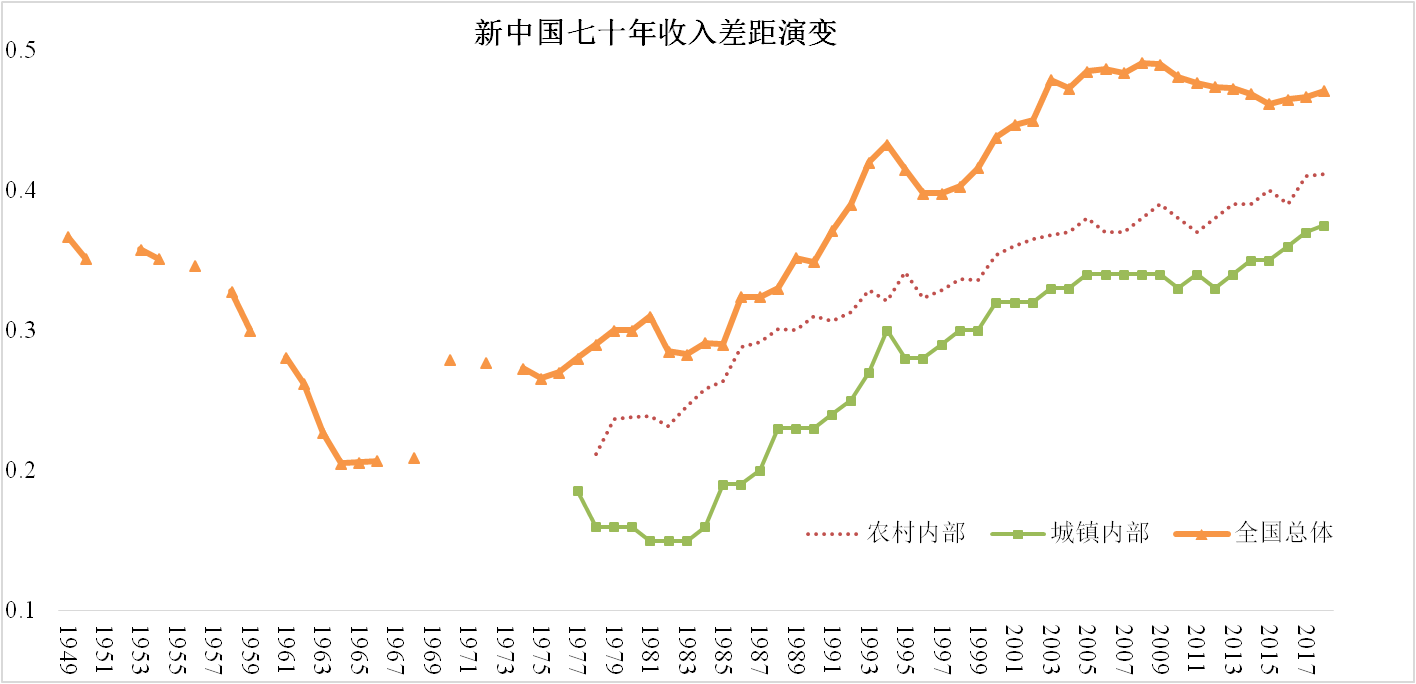 資料來源:全國基尼系數(shù)來自于世界銀行(1981-2001),收入分配課題組(2002)和國家統(tǒng)計(jì)局(2003-2017)的估計(jì)結(jié)果。農(nóng)村和城鎮(zhèn)的基尼系數(shù)來自于歷年的“中國居民收入分配年度報(bào)告”。2012-2017年農(nóng)村及2011-2017年城鎮(zhèn)內(nèi)部數(shù)據(jù)來自于省份加權(quán)計(jì)算結(jié)果。1978-1980年全國基尼系數(shù)來自于省份加權(quán)并調(diào)整的結(jié)果。1949-1977年全國總體、城鎮(zhèn)內(nèi)部、農(nóng)村內(nèi)部差距,都來自于UNU-WIDER數(shù)據(jù)庫。