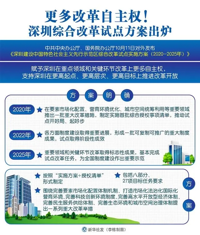 深圳又一次站上新起點。中共中央辦公廳、國務(wù)院辦公廳近日印發(fā)《深圳建設(shè)中國特色社會主義先行示范區(qū)綜合改革試點實施方案(2020-2025年)》,賦予深圳在重點領(lǐng)域和關(guān)鍵環(huán)節(jié)改革上更多自主權(quán),支持深圳在更高起點、更高層次、更高目標(biāo)上推進(jìn)改革開放。
