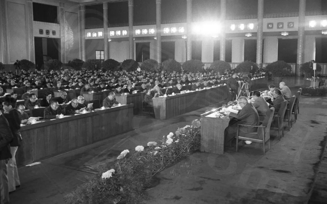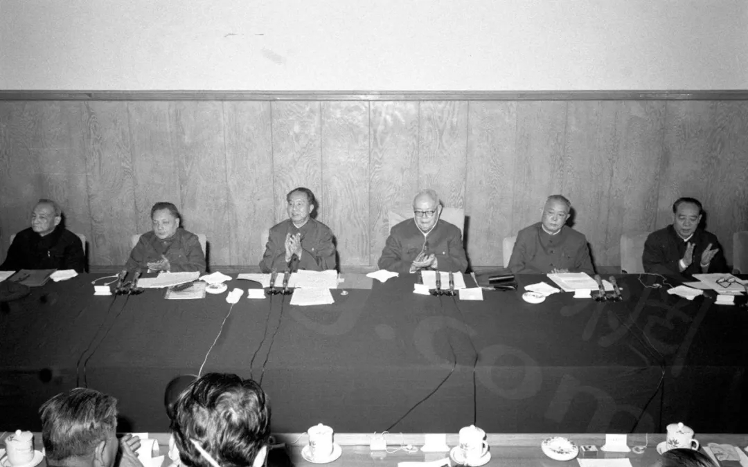 1978年12月18日至22日,中共十一屆三中全會在北京召開。陳云、鄧小平、華國鋒、葉劍英、李先念、汪東興(自左至右)在十一屆三中全會上