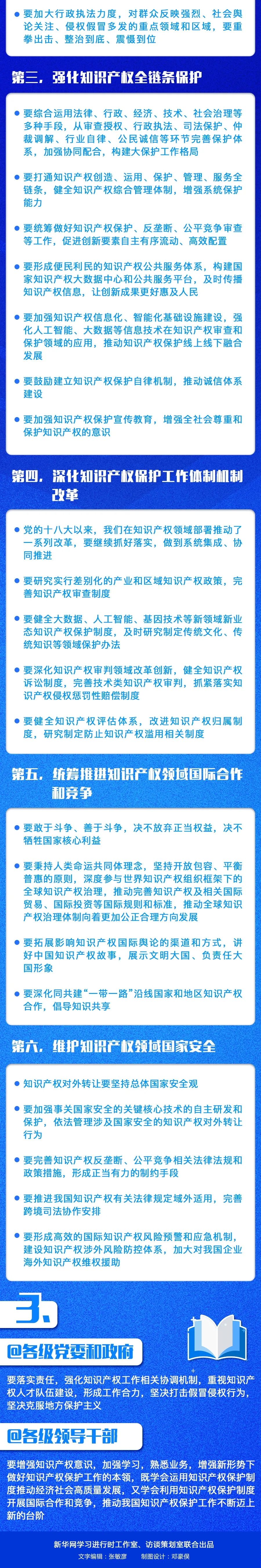 黨的十八大以來,我們在知識產權領域部署推動了一系列改革,要繼續(xù)抓好落實,做到系統(tǒng)集成、協(xié)同推進。要研究實行差別化的產業(yè)和區(qū)域知識產權政策,完善知識產權審查制度。要健全大數(shù)據、人工智能、基因技術等新領域新業(yè)態(tài)知識產權保護制度,及時研究制定傳統(tǒng)文化、傳統(tǒng)知識等領域保護辦法。要深化知識產權審判領域改革創(chuàng)新,健全知識產權訴訟制度,完善技術類知識產權審判,抓緊落實知識產權侵權懲罰性賠償制度。要健全知識產權評估體系,改進知識產權歸屬制度,研究制定防止知識產權濫用相關制度。