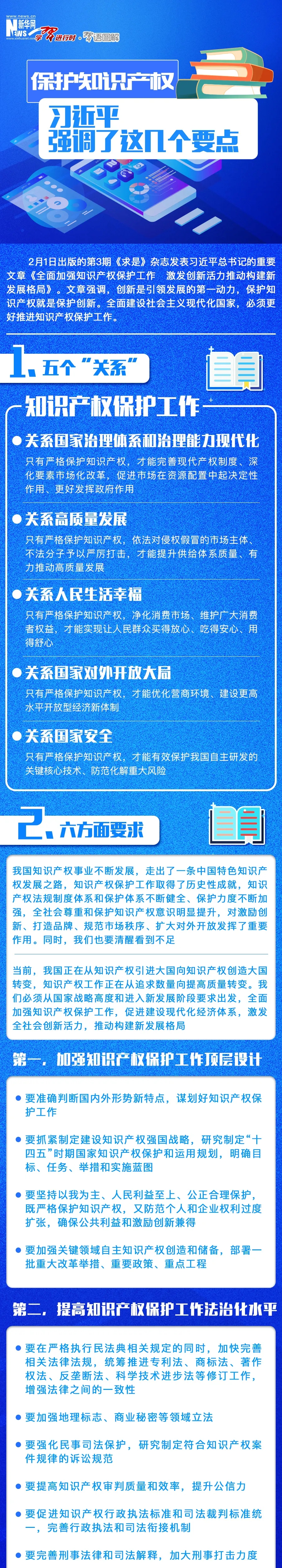 編者按:當前,我國正在從知識產權引進大國向知識產權創(chuàng)造大國轉變,知識產權工作正在從追求數(shù)量向提高質量轉變。進入新發(fā)展階段,如何全面加強知識產權保護工作?第3期《求是》雜志發(fā)表習近平總書記重要文章《全面加強知識產權保護工作 激發(fā)創(chuàng)新活力推動構建新發(fā)展格局》。文章從國家戰(zhàn)略高度和進入新發(fā)展階段要求出發(fā),對全面加強知識產權保護工作提出六點要求,一起來看。