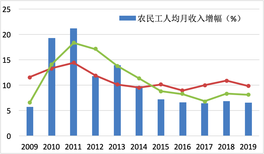 農(nóng)民工工資在2010年前后曾有過較快的提高,主要得益于各地最低工資的調(diào)整。值得注意的是,農(nóng)民工工資收入相對(duì)增速2015年后開始下降。農(nóng)民工年平均收入2017年是城鎮(zhèn)非私營(yíng)單位職工平均收入的56%,2019年下降為52.5%。
