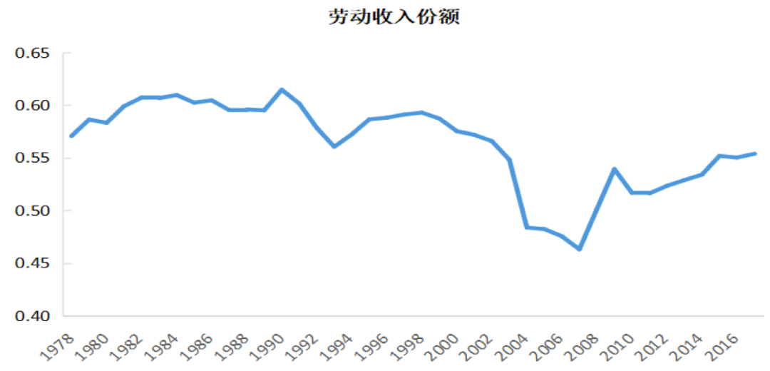 一是提高勞動(dòng)報(bào)酬占比。我國在經(jīng)濟(jì)高速發(fā)展過程中,勞動(dòng)所得占比曾出現(xiàn)一定程度的下降,2008年之后有所回升,但仍然偏低。
