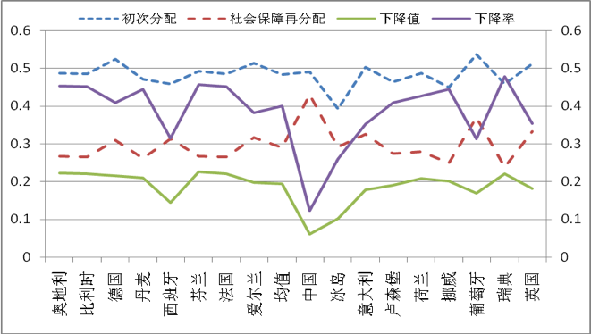 我國社會(huì)保障制度在平抑一次分配差距方面還遠(yuǎn)沒有發(fā)揮應(yīng)有的作用。據(jù)北師大收入分配研究院2017年的一項(xiàng)研究,18個(gè)歐盟國家市場(chǎng)收入的基尼系數(shù)為0.443,在社會(huì)保障的作用下,這些國家的可支配收入基尼系數(shù)降為0.29。從下降幅度來看,歐盟國家政府的社會(huì)保障政策使得其基尼系數(shù)的平均值下降了40%,相比之下,中國僅下降了12.3%。