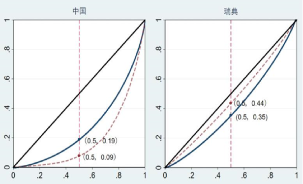 資料來源:中國的曲線根據(jù)CHIPS2018年調(diào)查數(shù)據(jù)計(jì)算繪制。瑞典的曲線根據(jù)Nieuwenhuis,Nelson和Alm在2020年發(fā)表論文中2003年的基尼系數(shù)與集中度的數(shù)據(jù)模擬繪制。