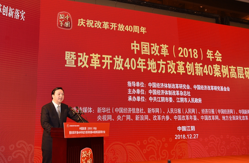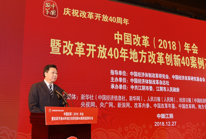 2018年12月27日,由中國經(jīng)濟體制改革研究會、中國經(jīng)濟改革研究基金會指導,中國經(jīng)濟體制改革雜志社主辦,中共江陰市委、江陰市人民政府承辦的“慶祝改革開放40周年——中國改革(2018)年會暨改革開放40年地方改革創(chuàng)新40案例高層研討會”在江蘇省江陰市召開。