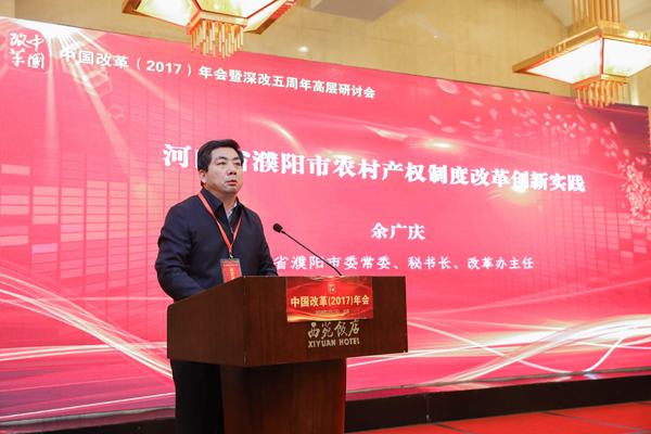 河南省濮陽(yáng)市委常委、秘書(shū)長(zhǎng)、改革辦主任余廣慶介紹了濮陽(yáng)特色鮮明的農(nóng)村集體產(chǎn)權(quán)制度改革經(jīng)驗(yàn):在推進(jìn)農(nóng)村集體產(chǎn)權(quán)制度改革中,濮陽(yáng)市農(nóng)村黨支部成為基層黨建工作的一個(gè)重大創(chuàng)新,市委領(lǐng)導(dǎo)親自上陣親自督辦、跟蹤進(jìn)度;建成了比較完善的市縣鄉(xiāng)三級(jí)產(chǎn)權(quán)交易平臺(tái),充分釋放農(nóng)村要素活力;依托市縣兩級(jí)黨校邀請(qǐng)專家解讀改革政策改革事件推動(dòng)農(nóng)村改革。