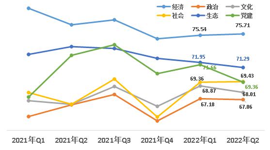 1、經(jīng)濟、社會領(lǐng)域小幅上升。從六大領(lǐng)域來看,經(jīng)濟領(lǐng)域得分75.71,政治領(lǐng)域得分67.06 ,文化領(lǐng)域得分68.01,社會領(lǐng)域得分69.43,生態(tài)領(lǐng)域得分71.29,黨建領(lǐng)域得分69.36。與上一季度相比,經(jīng)濟、社會領(lǐng)域小幅上升,其他領(lǐng)域均下降。其中黨建領(lǐng)域降幅最大,下降2.3。