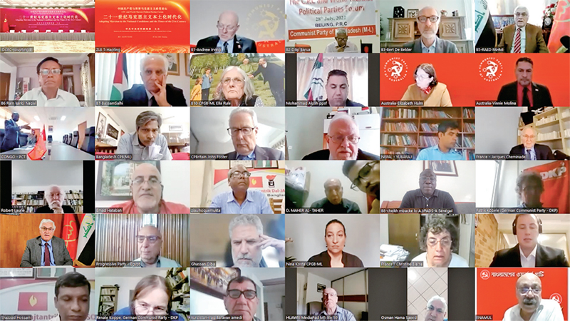 2022年7月28日,中國共產(chǎn)黨與世界馬克思主義政黨論壇舉行。習近平總書記在賀信中強調(diào),中國共產(chǎn)黨愿同各國馬克思主義政黨加強交流對話,立足本國國情,把準時代脈搏,不斷豐富和發(fā)展馬克思主義,在攜手推動構(gòu)建人類命運共同體的進程中讓馬克思主義展現(xiàn)出更強大的真理力量。圖為外國政黨代表線上參加論壇。 中共中央對外聯(lián)絡(luò)部供圖