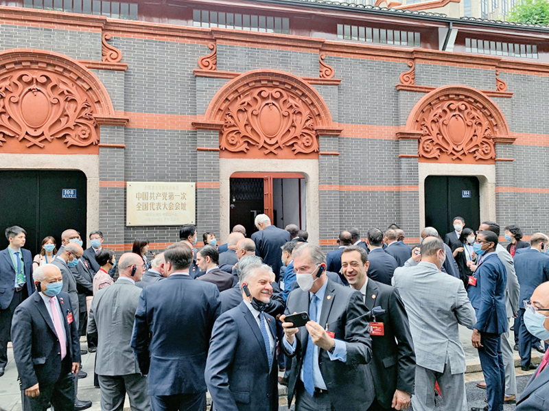 2021年6月16日,“中國共產(chǎn)黨的故事——習近平新時代中國特色社會主義思想在上海的實踐”特別對話會在上海舉行。近100個國家、126個政黨和友好組織的740多名代表通過視頻連線參加對話會,40多個國家駐華大使現(xiàn)場出席會議。圖為與會駐華使節(jié)參觀中共一大會址。 人民網(wǎng) 馬作鵬/攝