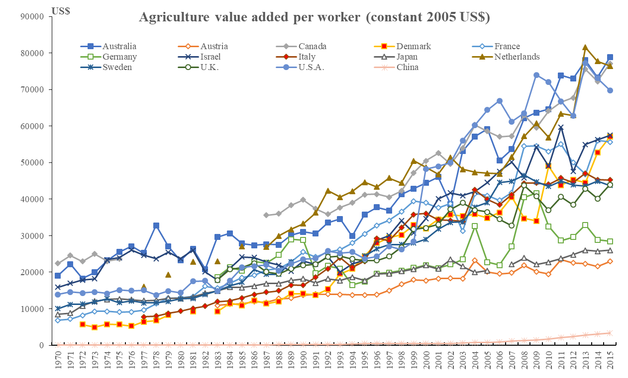 如圖5,西方城市化過程中兩個收入差距的縮小在中國沒有出現(xiàn)。中國在最快速城市化階段出現(xiàn)了城鄉(xiāng)收入差距拉大,第一是我們只有快速城市化,但沒有城鄉(xiāng)融合。第二是我們城市化的模式是回村的城市化模式。在城市里干工作,干到一定程度再回到農(nóng)村,這是全世界沒有的。第三是農(nóng)業(yè)競爭力下降?,F(xiàn)在一定要有一個認(rèn)識,農(nóng)業(yè)的份額降到10%以后,各個國家的農(nóng)業(yè)到底在干什么?我們現(xiàn)在想到農(nóng)業(yè)到10%,再到2%、1%,農(nóng)業(yè)就可有可無了,這種觀點是錯誤的。所有國家的農(nóng)業(yè)在降到10%以后,農(nóng)業(yè)在變強,它的農(nóng)業(yè)和原來的農(nóng)業(yè)完全不一樣。中國由于單向城市化的模式,最后農(nóng)業(yè)競爭力進(jìn)一步下降。(如圖6)我們現(xiàn)在只有6%、7%的農(nóng)業(yè),這個農(nóng)業(yè)的競爭力是下降的,背后是農(nóng)業(yè)成本上升,所有成本都在上升。