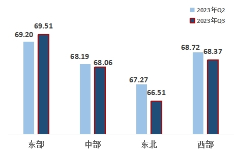 東部、西部、中部、東北地區(qū)指數(shù)分別為69.51、68.37、68.06、66.51。區(qū)域改革熱度指數(shù)呈適當(dāng)?shù)牡赜蛱卣?,東部地區(qū)領(lǐng)先,西部地區(qū)排名第二,且連續(xù)六個(gè)季度超越中部地區(qū),東北地區(qū)最后。與上一季度相比,東部地區(qū)改革熱度指數(shù)有所上升。