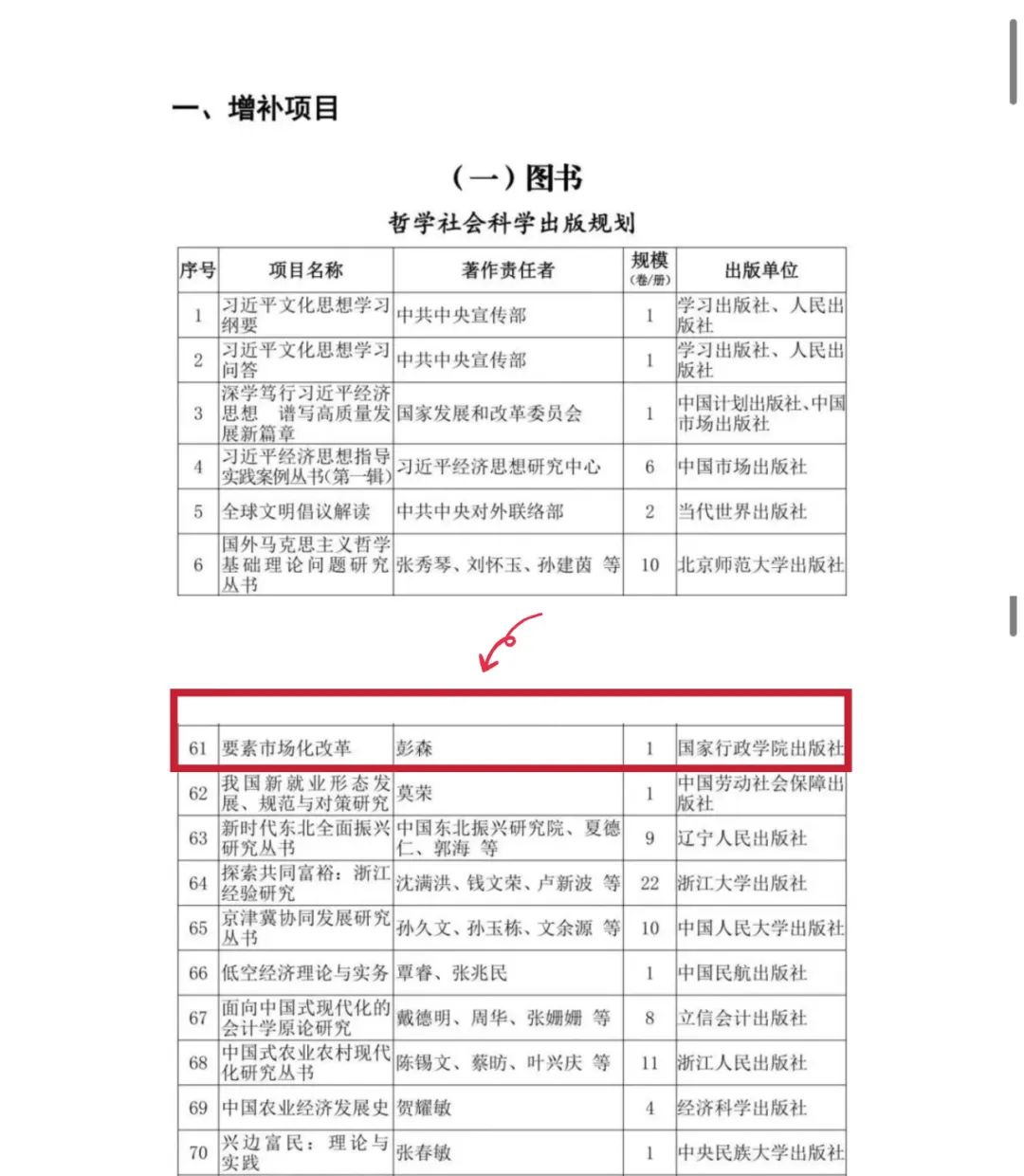 2024年8月29日,國(guó)家新聞出版署公布《“十四五”國(guó)家重點(diǎn)出版物出版規(guī)劃調(diào)整情況》,確定“十四五”國(guó)家重點(diǎn)出版物出版規(guī)劃增補(bǔ)項(xiàng)目590個(gè),其中圖書(shū)出版項(xiàng)目524個(gè)、音像電子出版項(xiàng)目59個(gè)、數(shù)字出版項(xiàng)目7個(gè)。我會(huì)彭森會(huì)長(zhǎng)主編的《要素市場(chǎng)化改革》入選“哲學(xué)社會(huì)科學(xué)出版規(guī)劃”項(xiàng)目。