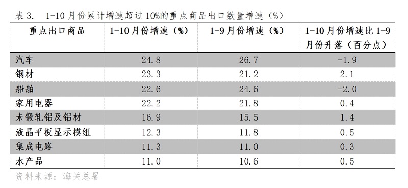1-10月份,累計(jì)出口數(shù)量增長(zhǎng)速度超過(guò)10%的重點(diǎn)商品共有8類(lèi),與1-9月份持平,其中6類(lèi)增速回升,2類(lèi)增速回落,即汽車(chē)出口增長(zhǎng)24.8%,鋼材出口增長(zhǎng)23.3%,船舶出口增長(zhǎng)22.6%,家用電器出口增長(zhǎng)22.2%,未鍛軋鋁及鋁材出口增長(zhǎng)16.9%,液晶平板顯示模組出口增長(zhǎng)12.3%,集成電路出口增長(zhǎng)11.3%,水產(chǎn)品出口增長(zhǎng)11.0%。