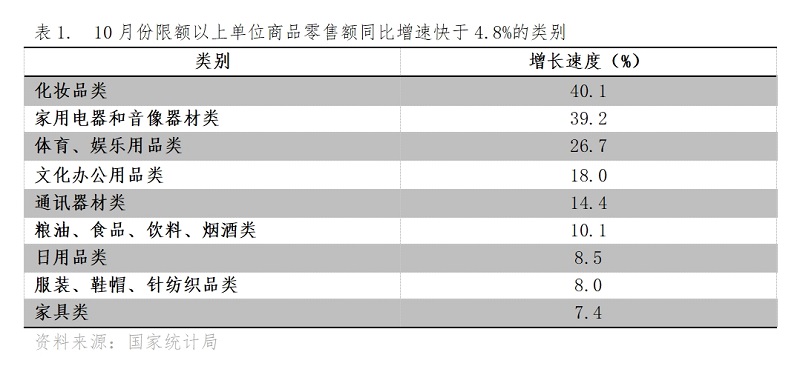 10月份,限額以上單位商品零售額增速快于社會(huì)消費(fèi)品零售總額4.8%增速的共有9類(lèi),即化妝品類(lèi)同比增長(zhǎng)40.1%,家用電器和音像器材類(lèi)增長(zhǎng)39.2%,體育、娛樂(lè)用品類(lèi)增長(zhǎng)26.7%,文化辦公用品類(lèi)增長(zhǎng)18.0%,通訊器材類(lèi)增長(zhǎng)14.4%,糧油、食品、飲料、煙酒類(lèi)增長(zhǎng)10.1%,日用品類(lèi)增長(zhǎng)8.5%,服裝、鞋帽、針紡織品類(lèi)增長(zhǎng)8.0%,家具類(lèi)增長(zhǎng)7.4%。
