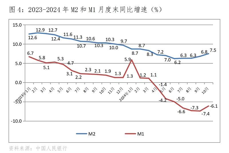 (四)M2增速持續(xù)回升。10月末,廣義貨幣供應(yīng)量(M2)同比增長(zhǎng)7.5%,比9月末增長(zhǎng)6.8%回升0.7個(gè)百分點(diǎn),9月末增速比8月末增速回升了0.5個(gè)百分點(diǎn);狹義貨幣供應(yīng)量(M1)降幅由擴(kuò)大轉(zhuǎn)為縮小,10月末同比下降6.1%,比9月末下降7.4%縮小1.3個(gè)百分點(diǎn),而9月末降幅比8月末降幅擴(kuò)大0.1個(gè)百分點(diǎn),扭轉(zhuǎn)了自5月末以來(lái)降幅逐月擴(kuò)大的趨勢(shì);流通中貨幣(M0)增速由落轉(zhuǎn)升,10月末同比增長(zhǎng)12.8%,比9月末增長(zhǎng)11.5%回升了1.3個(gè)百分點(diǎn),而9月末增速比8月末增速回落了0.7個(gè)百分點(diǎn)。貨幣供應(yīng)量增速的回升或降幅的縮小,對(duì)經(jīng)濟(jì)回升將發(fā)揮著積極的重要作用。