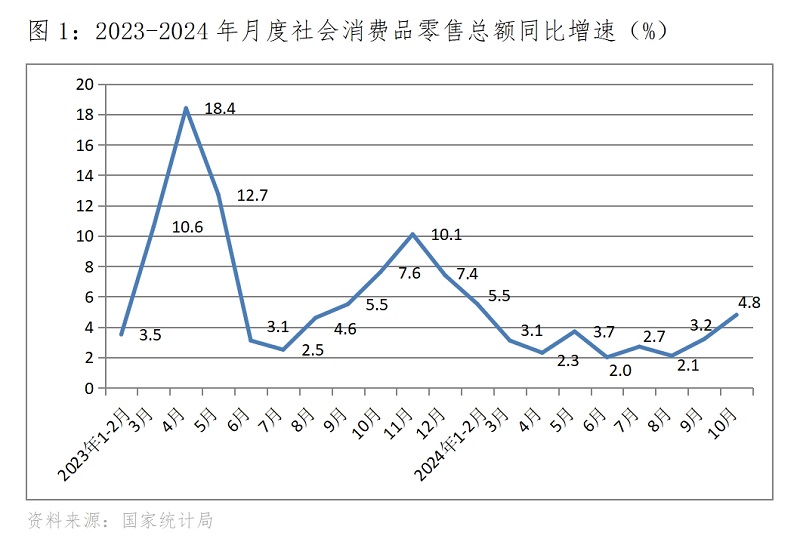 (一)零售增速繼續(xù)回升。10月份,社會(huì)消費(fèi)品零售總額同比增長(zhǎng)4.8%,比9月份增長(zhǎng)3.2%回升了1.6個(gè)百分點(diǎn),9月份比8月份增長(zhǎng)2.1%回升了1.1個(gè)百分點(diǎn)。社會(huì)消費(fèi)品零售總額增速的持續(xù)回升,既反映了政策措施取得了積極效果,也說(shuō)明消費(fèi)者對(duì)有效政策措施的響應(yīng)較為積極。隨著消費(fèi)品以舊換新政策措施力度的不斷加大,家用電器和音像器材以及汽車(chē)零售額增長(zhǎng)加快或由負(fù)轉(zhuǎn)正,10月份限額以上企業(yè)家用電器和音像器材零售額增長(zhǎng)39.2%,比9月份加快17.7個(gè)百分點(diǎn),9月份比8月份加快17.1個(gè)百分點(diǎn);汽車(chē)零售額增長(zhǎng)3.7%,比9月份加快3.3個(gè)百分點(diǎn),9月份為增長(zhǎng)0.4%,8月份為下降7.3%??梢?jiàn),實(shí)施有效的政策措施對(duì)擴(kuò)大消費(fèi)的效果是明顯的積極的。