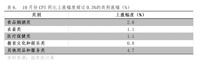 漲幅超過(guò)CPI同比上漲0.3%的類(lèi)別共有5類(lèi),即食品煙酒類(lèi)價(jià)格同比上漲2.0%,衣著類(lèi)上漲1.1%,醫(yī)療保健類(lèi)上漲1.1%,教育文化和娛樂(lè)類(lèi)上漲0.8%,其他用品和服務(wù)類(lèi)上漲4.7%。