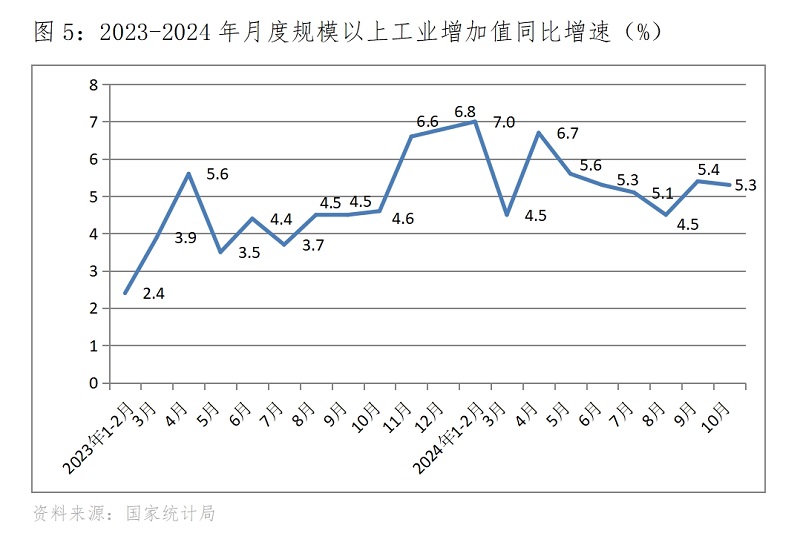 (一)工業(yè)增速由升轉(zhuǎn)落。10月份,規(guī)模以上工業(yè)增加值同比增長(zhǎng)5.3%,比9月份增長(zhǎng)5.4%回落了0.1個(gè)百分點(diǎn),9月份比8月份回升了0.9個(gè)百分點(diǎn)。10月份工業(yè)增速回落,雖然幅度不大,但這是在9月份回升后的回落,也是在上年同期基數(shù)并不高的基礎(chǔ)上的回落,而且還是在政策措施力度不斷加大下的回落,充分說(shuō)明工業(yè)回升仍面臨著較大的壓力。