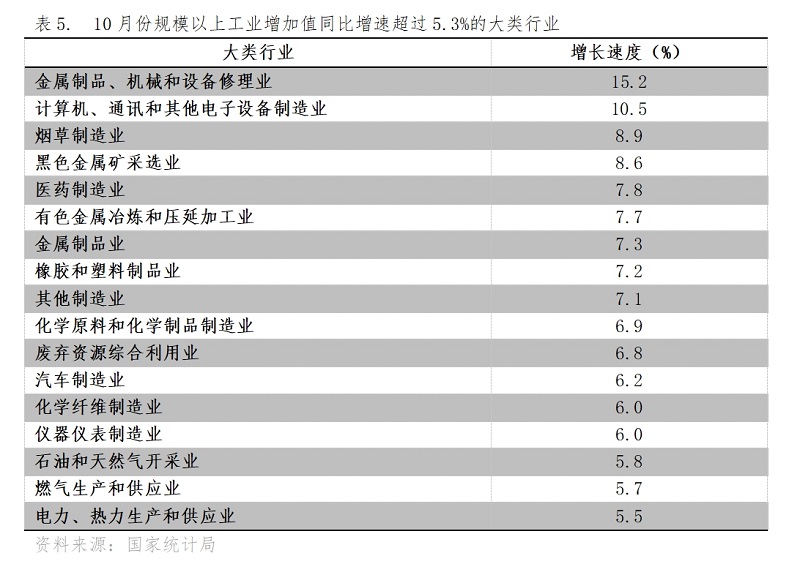 10月份,增長(zhǎng)速度超過(guò)規(guī)模以上工業(yè)增長(zhǎng)5.3%的主要大類(lèi)行業(yè)共有17個(gè),即金屬制品、機(jī)械和設(shè)備修理業(yè)同比增長(zhǎng)15.2%,計(jì)算機(jī)、通訊和其他電子設(shè)備制造業(yè)增長(zhǎng)10.5%,煙草制造業(yè)增長(zhǎng)8.9%,黑色金屬礦采選業(yè)增長(zhǎng)8.6%,醫(yī)藥制造業(yè)增長(zhǎng)7.8%,有色金屬冶煉和壓延加工業(yè)增長(zhǎng)7.7%,金屬制品業(yè)增長(zhǎng)7.3%,橡膠和塑料制品業(yè)增長(zhǎng)7.2%,其他制造業(yè)增長(zhǎng)7.1%,化學(xué)原料和化學(xué)制品制造業(yè)增長(zhǎng)6.9%,廢棄資源綜合利用業(yè)增長(zhǎng)6.8%,汽車(chē)制造業(yè)增長(zhǎng)6.2%,化學(xué)纖維制造業(yè)增長(zhǎng)6.0%,儀器儀表制造業(yè)增長(zhǎng)6.0%,石油和天然氣開(kāi)采業(yè)增長(zhǎng)5.8%,燃?xì)馍a(chǎn)和供應(yīng)業(yè)增長(zhǎng)5.7%,電力、熱力生產(chǎn)和供應(yīng)業(yè)增長(zhǎng)5.5%。