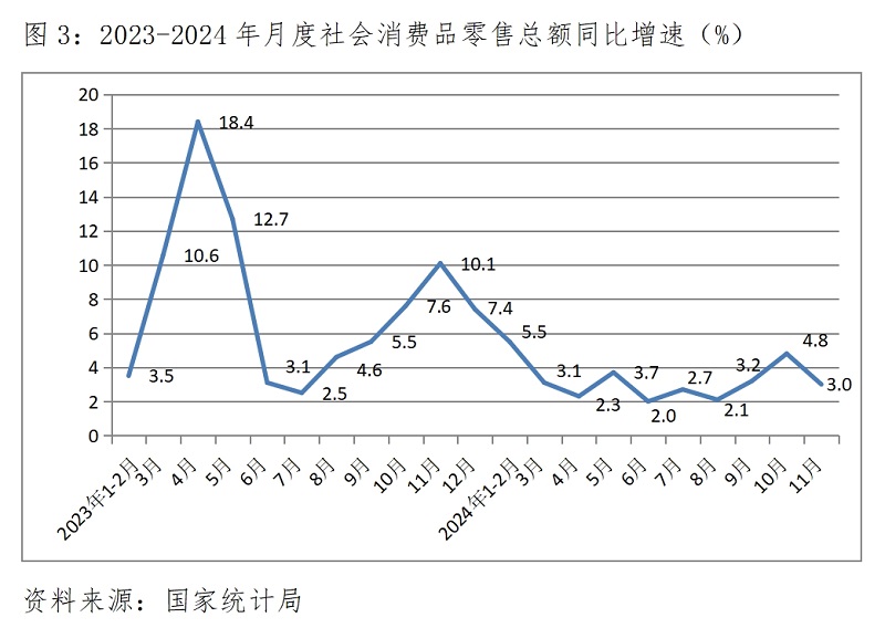 (一)零售增速由升轉(zhuǎn)落。11月份,社會消費品零售總額同比增長3.0%,比10月份增長4.8%回落1.8個百分點,而10月份增速比9月份增速3.2%回升了1.6個百分點。但受消費品以舊換新政策措施的持續(xù)作用,家用電器和音像器材和汽車銷售仍保持較快增長,11月份限額以上企業(yè)家用電器和音像器材零售額繼續(xù)保持調(diào)整增長22.2%,已連續(xù)3個月保持兩位數(shù)增長;汽車零售額增長6.6%,比上月回升2.9個百分點,10月份比9月份回升3.3個百分點,已連續(xù)兩個月以大約3.0個百分點回升。