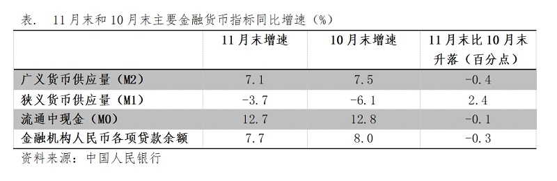 (四)M2增速由升轉(zhuǎn)落。11月末,廣義貨幣供應(yīng)量(M2)同比增長7.1%,比10月末增長7.5%回落0.4個百分點,10月末增速比9月末增速回升0.7個百分點;狹義貨幣供應(yīng)量(M1)降幅繼續(xù)縮小,11月末同比下降3.7%,比10月末同比下降6.1%縮小2.4個百分點,10月末降幅比9月末降幅縮小1.3個百分點;流通中貨幣(M0)增速由升轉(zhuǎn)落,11月末同比增長12.7%,比10月末增長12.8%回落0.1介百分點,10月末增速比9月末增速回升了1.3個百分點。各層次貨幣供應(yīng)量又出現(xiàn)了不同方向的變化走勢。