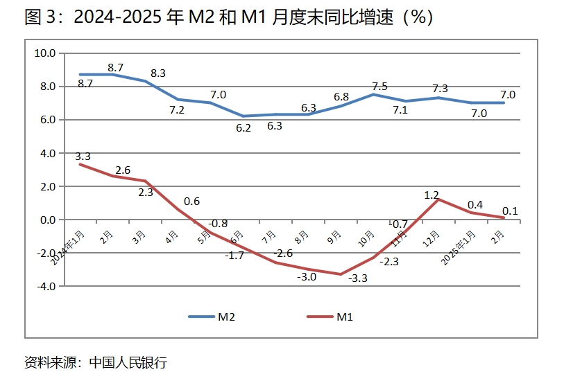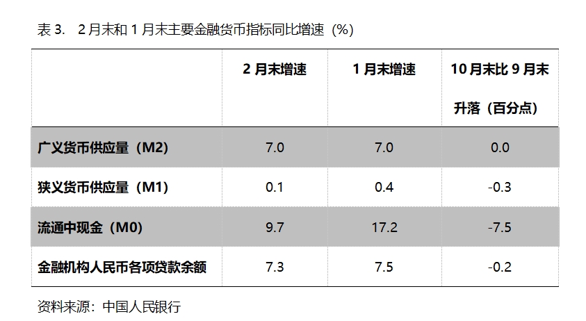 (三)M2增速由落轉(zhuǎn)平。2月末,廣義貨幣供應(yīng)量(M2)同比增長7.0%,與1月末增長7.0%持平,1月末增速比上年12月末增速回落了0.3個(gè)百分點(diǎn);狹義貨幣供應(yīng)量(M1)增速持續(xù)回落,2月末同比增長0.1%,比1月末增長0.4%回落0.3個(gè)百分點(diǎn),而1月末增幅比上年12月末增幅回落0.8個(gè)百分點(diǎn);流通中貨幣(M0)增速由升轉(zhuǎn)落,2月末同比增長9.7%,比1月末增長17.2%回落了7.5個(gè)百分點(diǎn),而1月末增速比上年12月末增速回升了4.2個(gè)百分點(diǎn)。按照貨幣政策適度寬松的要求,貨幣供應(yīng)量增速存在著提速的必要。