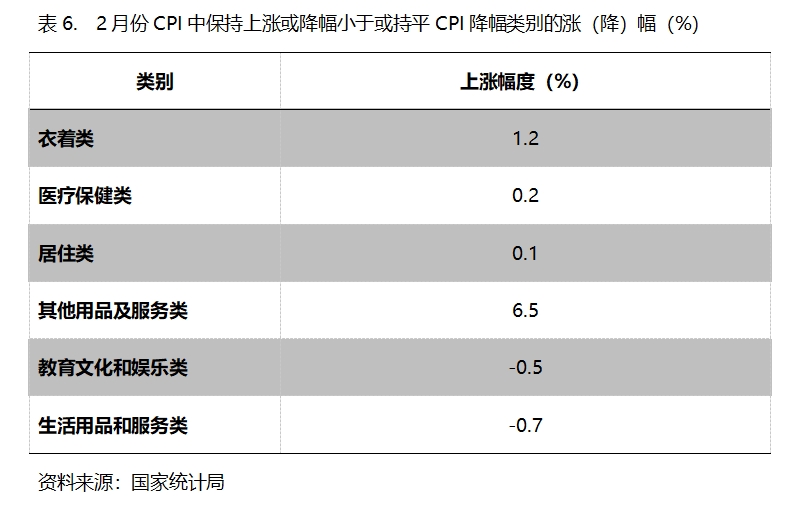 CPI中保持上漲的類別共4類,即衣著類價(jià)格同比上漲1.2%,醫(yī)療保健類上漲0.2%,居住類上漲0.1%,其他用品和服務(wù)類上漲6.5%;降幅小于或持平CPI降幅的類別共2類,即教育文化和娛樂類下降0.5%,生活用品及服務(wù)下降0.7%。