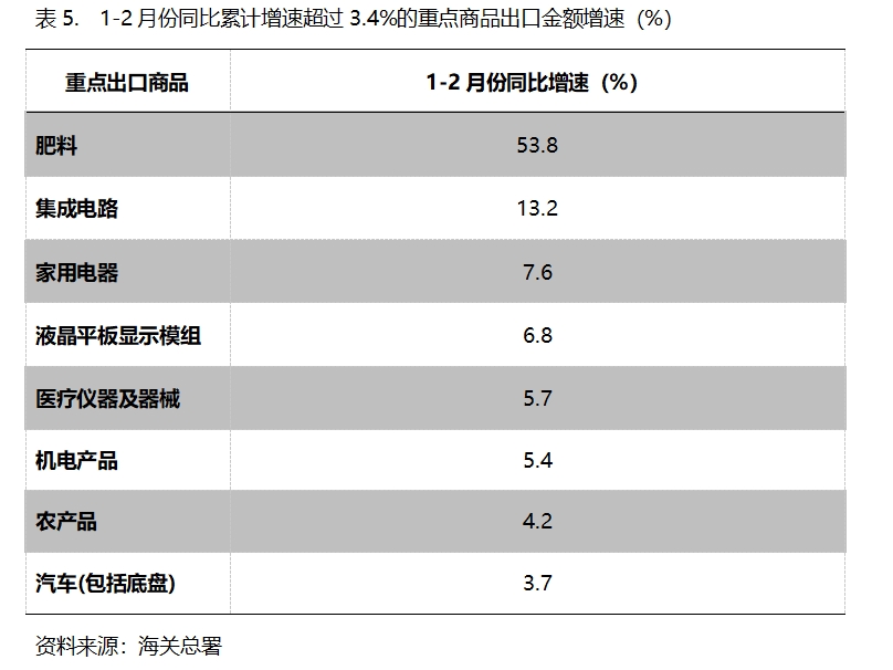 1-2月份,出口金額同比增速超過3.4%的重點(diǎn)商品共有8類,即肥料出口增長53.8%,集成電路增長13.2%,家用電器增長7.6%,液晶平板顯示模組增長6.8%,醫(yī)療儀器及器械增長5.7%,機(jī)電產(chǎn)品增長5.4%,農(nóng)產(chǎn)品增長4.2%,汽車(包括底盤)增長3.7%。