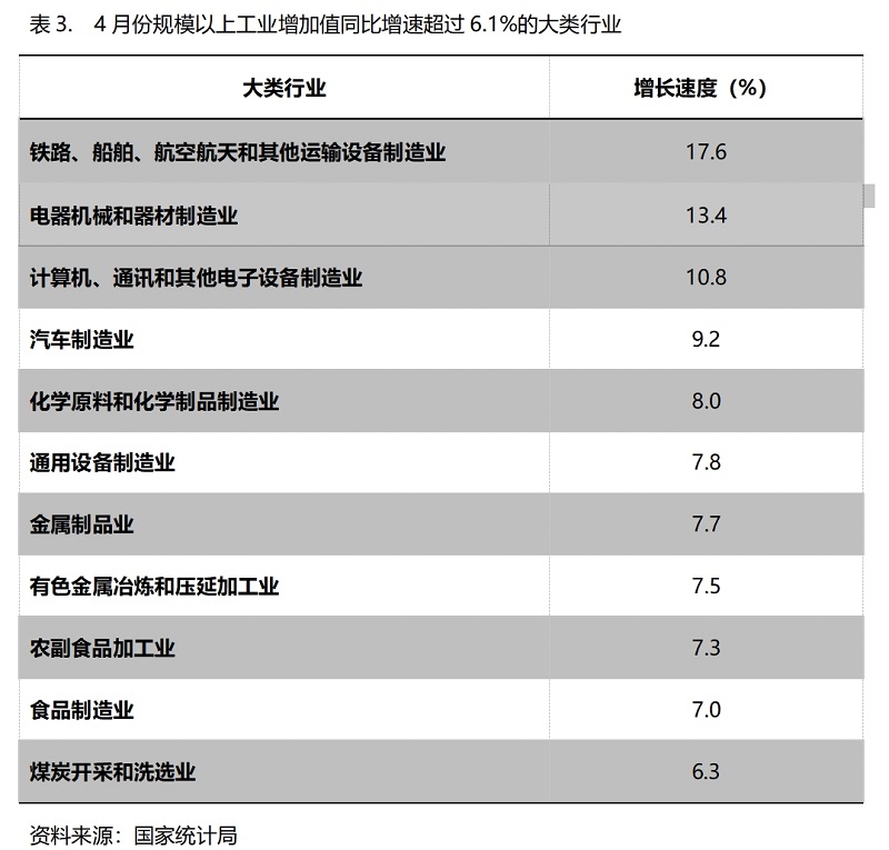 4月份,增長(zhǎng)速度超過(guò)規(guī)模以上工業(yè)增長(zhǎng)6.1%的主要大類行業(yè)共有11個(gè),即鐵路、船舶、航空航天和其他運(yùn)輸設(shè)備制造業(yè)增長(zhǎng)17.6%,電器機(jī)械和器材制造業(yè)增長(zhǎng)13.4%,計(jì)算機(jī)、通訊和其他電子設(shè)備制造業(yè)增長(zhǎng)10.8%,汽車制造業(yè)增長(zhǎng)9.2%,化學(xué)原料和化學(xué)制品制造業(yè)增長(zhǎng)8.0%,通用設(shè)備制造業(yè)增長(zhǎng)7.8%,金屬制品業(yè)增長(zhǎng)7.7%,有色金屬冶煉和壓延加工業(yè)增長(zhǎng)7.5%,農(nóng)副食品加工業(yè)增長(zhǎng)7.3%,食品制造業(yè)增長(zhǎng)7.0%,煤炭開(kāi)采和洗選業(yè)增長(zhǎng)6.3%。