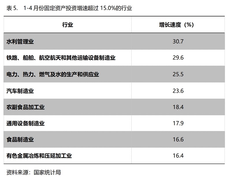 1-4月份,固定資產(chǎn)投資增速超過(guò)15%的主要行業(yè)共8個(gè),即水利管理業(yè)增長(zhǎng)30.7%,鐵路、船舶、航空航天和其他運(yùn)輸設(shè)備制造業(yè)增長(zhǎng)29.6%,電力、熱力、燃?xì)饧八纳a(chǎn)和供應(yīng)業(yè)增長(zhǎng)25.5%,汽車制造業(yè)增長(zhǎng)23.6%,農(nóng)副食品加工業(yè)增長(zhǎng)18.4%,通用設(shè)備制造業(yè)增長(zhǎng)17.9%,食品制造業(yè)增長(zhǎng)16.6%,有色金屬冶煉和壓延加工業(yè)增長(zhǎng)16.4%。