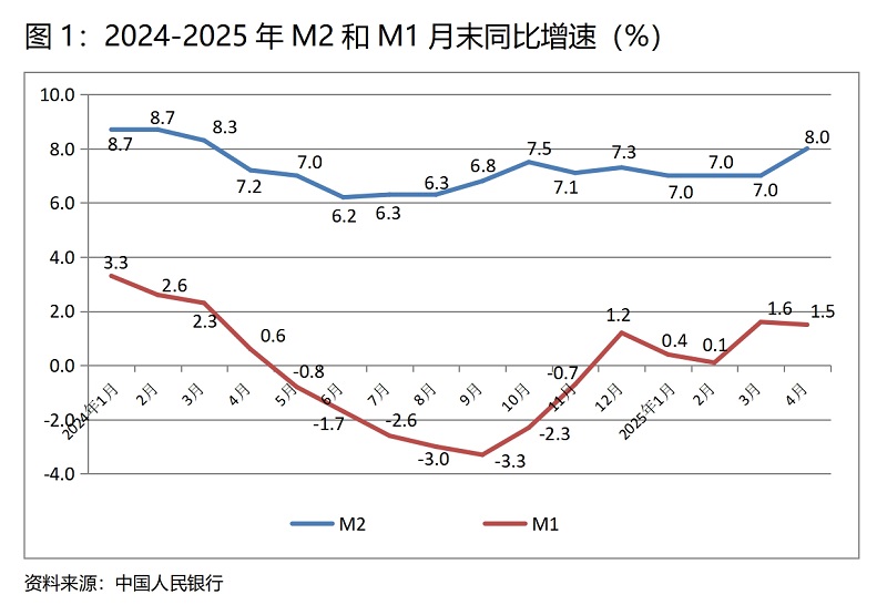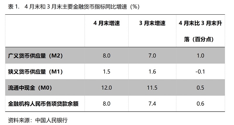 (一)M2增速由平轉(zhuǎn)升。4月末,廣義貨幣供應(yīng)量(M2)同比增長(zhǎng)8.0%,比3月末增長(zhǎng)7.0%回升1.0個(gè)百分點(diǎn),實(shí)際上這是在今年前三個(gè)月末連續(xù)保持7.0%增速基礎(chǔ)上的回升;狹義貨幣供應(yīng)量(M1)增速比上月略有回落,4月末同比增長(zhǎng)1.5%,比3月末增長(zhǎng)1.6%回落0.1個(gè)百分點(diǎn),而3月末增幅比2月末增幅回升1.5個(gè)百分點(diǎn);流通中貨幣(M0)增速由升轉(zhuǎn)落,4月末同比增長(zhǎng)12.0%,比3月末增長(zhǎng)11.5%回升0.5個(gè)百分點(diǎn),而3月末增速比2月末增速回升了1.8個(gè)百分點(diǎn)。貨幣政策正按照適度寬松的要求運(yùn)行,這對(duì)推動(dòng)經(jīng)濟(jì)回升將發(fā)揮積極作用,但各層次貨幣供應(yīng)量增速較大差異反映出的問(wèn)題需引起關(guān)注。