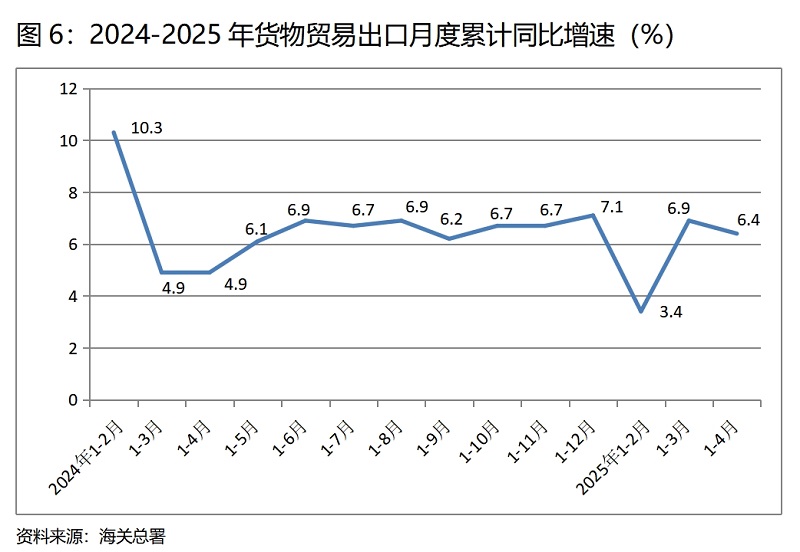 (六)貨物出口增速由升轉(zhuǎn)落。1-4月份,貨物出口同比增長(zhǎng)6.4%,比1-3月份增長(zhǎng)6.9%回落0.5個(gè)百分點(diǎn),1-3月份比1-2月份回升3.5個(gè)百分點(diǎn),增速呈現(xiàn)出由升轉(zhuǎn)落的態(tài)勢(shì)。貨物出口對(duì)主要貿(mào)易出口經(jīng)濟(jì)體增速有平有落也有升,1-4月份對(duì)歐盟出口同比增長(zhǎng)4.9%,與1-3月份4.9%的增速持平;對(duì)美國(guó)出口下降2.5%,1-3月份增長(zhǎng)5.6%,增速由增長(zhǎng)轉(zhuǎn)為下降;對(duì)東盟出口增長(zhǎng)11.5%,比1-3月份增長(zhǎng)9.2%回升2.3個(gè)百分點(diǎn);對(duì)拉丁美洲出口增長(zhǎng)11.5%,比1-3月份增長(zhǎng)10.7%回升0.8個(gè)百分點(diǎn)。在美國(guó)濫用關(guān)稅政策、對(duì)美國(guó)出口出現(xiàn)下降的情況下,我國(guó)出口仍能保持較快增長(zhǎng),特別是對(duì)一些主要經(jīng)濟(jì)體增長(zhǎng)呈現(xiàn)加快的勢(shì)頭,充分說(shuō)明我國(guó)出口不僅有較強(qiáng)的競(jìng)爭(zhēng)力,也有較強(qiáng)的韌性。