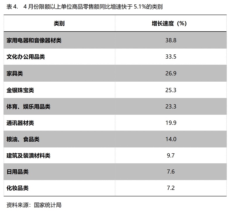 4月份,限額以上單位商品零售額增速快于社會(huì)消費(fèi)品零售總額5.1%增速的共有10類,即家用電器和音像器材類增長(zhǎng)38.8%,文化辦公用品類增長(zhǎng)33.5%,家具類增長(zhǎng)26.9%,金銀珠寶類增長(zhǎng)25.3%,體育、娛樂(lè)用品類增長(zhǎng)23.3%,通訊器材類增長(zhǎng)19.9%,糧油、食品類增長(zhǎng)14.0%,建筑及裝潢材料類增長(zhǎng)9.7%,日用品類增長(zhǎng)7.6%,化妝品類同比增長(zhǎng)7.2%。