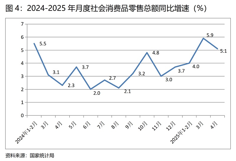 (四)零售增速由升轉(zhuǎn)落。4月份,社會(huì)消費(fèi)品零售總額同比增長(zhǎng)5.1%,比3月份增長(zhǎng)5.8%回落了0.7個(gè)百分點(diǎn),3月份比1-2月份增長(zhǎng)4.0%回升了1.9個(gè)百分點(diǎn)。4月份社會(huì)消費(fèi)品零售總額增速的回落,盡管有汽車及其油價(jià)下降的因素,但應(yīng)看到這是在上年同期基數(shù)較低基礎(chǔ)上的回落,說(shuō)明消費(fèi)需求不足的問(wèn)題仍還比較突出,在面對(duì)較大不確定性的國(guó)際局勢(shì),研究謀劃更加有效的擴(kuò)大消費(fèi)特別是服務(wù)消費(fèi)的政策措施顯得十分重要。