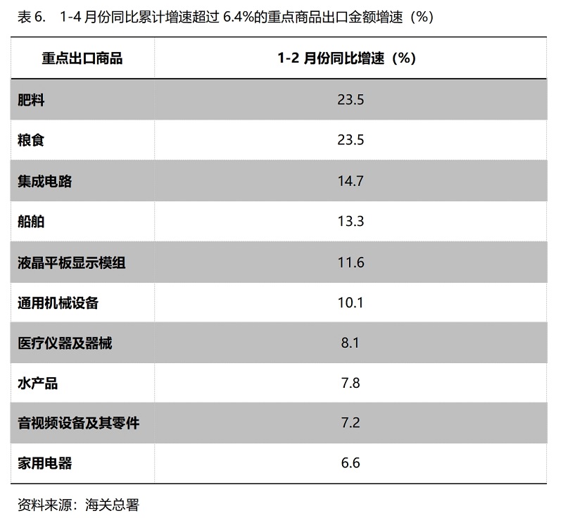 1-4月份,出口金額同比增速超過(guò)6.4%的重點(diǎn)商品共有10類,即肥料出口增長(zhǎng)23.5%,糧食增長(zhǎng)23.5%,集成電路增長(zhǎng)14.7%,船舶增長(zhǎng)13.3%,液晶平板顯示模組增長(zhǎng)11.6%,通用機(jī)器設(shè)備增長(zhǎng)10.1%,醫(yī)療儀器及器械增長(zhǎng)8.1%,水產(chǎn)品增長(zhǎng)7.8%,音視頻設(shè)備及其零件增長(zhǎng)7.2%,家用電器增長(zhǎng)6.6%。