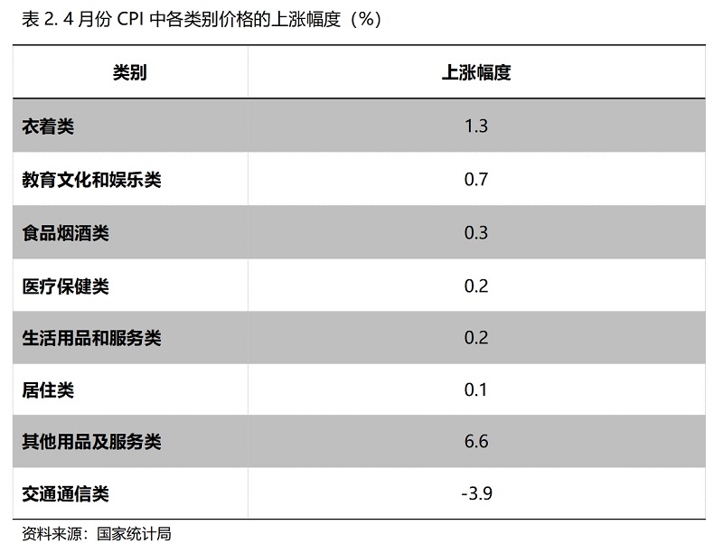 4月份,在CPI 8個(gè)類別中有7個(gè)類別保持上漲,1個(gè)類別下降。上漲的7個(gè)類別包括衣著類價(jià)格同比上漲1.3%,教育文化和娛樂(lè)類上漲0.7%,食品煙酒類上漲0.3%,醫(yī)療保健類上漲0.2%,生活用品及服務(wù)類上漲0.2%,居住類上漲0.1%,其他用品和服務(wù)類上漲6.6%;下降的雖然就交通通信類1個(gè)類別,但降幅較大,4月份同比下降3.9%。
