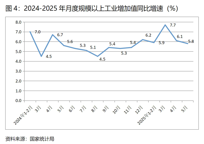 (四)工業(yè)增速持續(xù)回落。5月份,規(guī)模以上工業(yè)增加值同比增長(zhǎng)5.8%,比上月增長(zhǎng)6.1%回落了0.3個(gè)百分點(diǎn),4月份比3月份回落了1.6個(gè)百分點(diǎn),呈現(xiàn)出兩個(gè)月的連續(xù)回落。從工業(yè)三大門(mén)類看,主要是制造業(yè)增速回落。5月份采礦業(yè)同比增長(zhǎng)5.7%,與上月持平;制造業(yè)增長(zhǎng)6.2%,比上月回落0.4個(gè)百分點(diǎn);電力、熱力、燃?xì)饧八a(chǎn)和供應(yīng)業(yè)增長(zhǎng)2.2%,比上月回升0.1個(gè)百分點(diǎn)。5月份工業(yè)增速回落幅度雖然比上月收窄不少,但還是要密切關(guān)注回落背后反映出的工業(yè)增長(zhǎng)動(dòng)力未來(lái)可能變動(dòng)的趨勢(shì)。
