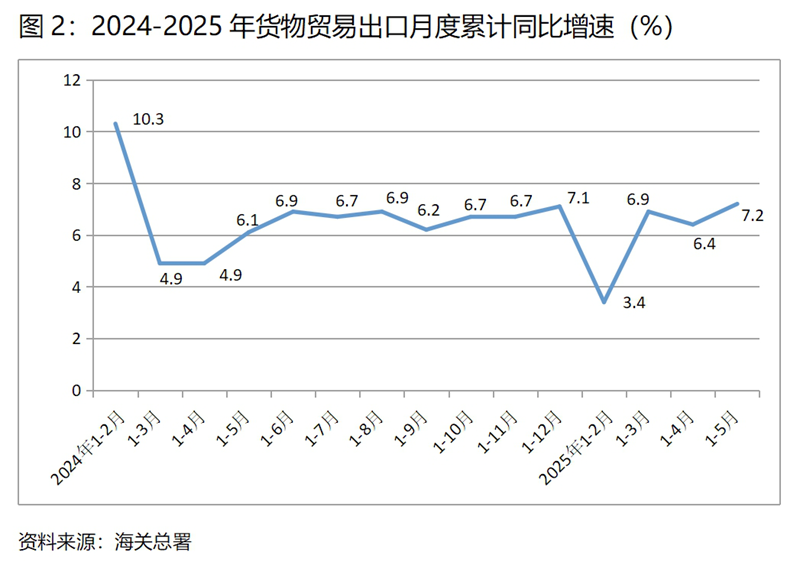(二)貨物出口增速由落轉(zhuǎn)升。1-5月份,貨物出口同比增長(zhǎng)7.2%,比1-4月份增長(zhǎng)6.4%回升0.8個(gè)百分點(diǎn),1-4月份比1-3月份回落0.5個(gè)百分點(diǎn),增速呈現(xiàn)出由落轉(zhuǎn)升的態(tài)勢(shì)。貨物出口對(duì)主要貿(mào)易出口經(jīng)濟(jì)體增速有升有落,1-5月份對(duì)歐盟出口同比增長(zhǎng)7.7%,比1-4月份4.9%增速回升2.8個(gè)百分點(diǎn);對(duì)美國(guó)出口下降8.7%,比1-4月份下降2.5%擴(kuò)大6.2個(gè)百分點(diǎn);對(duì)東盟出口增長(zhǎng)13.5%,比1-4月份11.5%增速回升2.0個(gè)百分點(diǎn);對(duì)拉丁美洲出口增長(zhǎng)10.6%,比1-4月份11.5%增速回落0.9個(gè)百分點(diǎn)。盡管5月12日中美發(fā)表聯(lián)合公報(bào)同意在90天內(nèi)暫時(shí)調(diào)降“對(duì)等關(guān)稅”中的稅率,但我國(guó)對(duì)美出口降幅仍出現(xiàn)進(jìn)一步擴(kuò)大的趨勢(shì),與整個(gè)出口增長(zhǎng)加快形成了明顯反差,說(shuō)明中美貿(mào)易關(guān)系的復(fù)雜性和較大的不確定性。