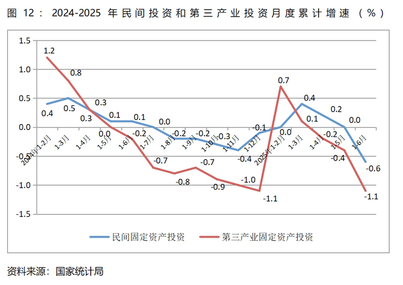 (二)民間投資和第三產(chǎn)業(yè)投資增速均由增長轉(zhuǎn)為下降,餐飲收入增速回落較多。上半年民間固定資產(chǎn)投資同比下降0.6%,一季度為增長0.4%,這是自2023年9月以來月度累計(jì)的最大降幅;第三產(chǎn)業(yè)固定資產(chǎn)投資同比下降1.1%,一季度為增長0.1%,這是今年以來月度累計(jì)的最大降幅;餐飲收入同比增長4.3%,比一季度增長4.7%回落了0.4個(gè)百分點(diǎn),比上年同期增長7.9%回落3.6個(gè)百分點(diǎn)。這些指標(biāo)增速的變化需引起宏觀調(diào)控政策的高度關(guān)注。