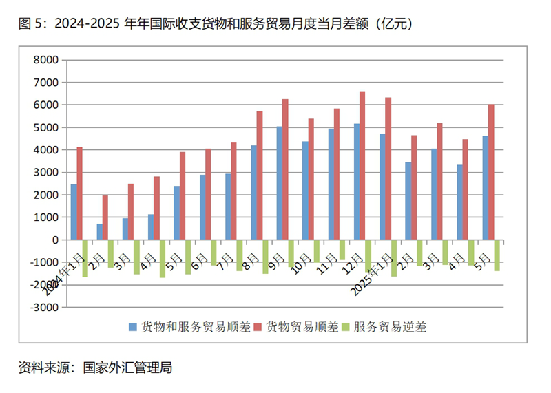 (四)國際收支貨物和服務(wù)貿(mào)易順差持續(xù)增加。今年1月份國際收支貨物和服務(wù)貿(mào)易順差比上年同月增加2252億元;2月份順差增加2735億元,3月順差增加3093億元,4月順差增加2199億元,5月順差增加2249億元,國際收支貨物和服務(wù)貿(mào)易順差比上年同期有著明顯的增加。在美國“對(duì)等關(guān)稅”政策的沖擊下,國際收支貨物和服務(wù)貿(mào)易仍實(shí)現(xiàn)較大的順差,足以說明我國經(jīng)濟(jì)有著較強(qiáng)的國際競(jìng)爭(zhēng)力。