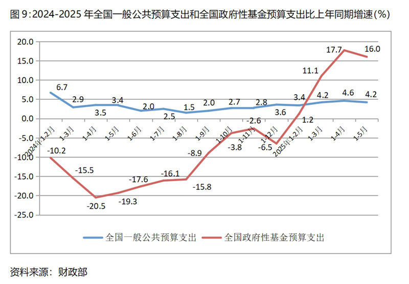 (四)一般公共預(yù)算支出增速與一季度持平、比上年同期回升,政府性基金預(yù)算支出增速比一季度回升、由上年同期下降轉(zhuǎn)為增長。1-5月份全國一般公共預(yù)算支出同比增長4.2%,與一季度增長4.2%持平,比上年同期增長3.4%回升了0.8個(gè)百分點(diǎn),但增速仍有一些偏慢;全國政府性基金預(yù)算支出同比增長16.0%,比一季度增長11.1%回升4.9個(gè)百分點(diǎn),上年同期為下降19.3%,呈現(xiàn)出明顯回升的態(tài)勢(shì)。從拉動(dòng)經(jīng)濟(jì)增長的要求看,特別是在面對(duì)微觀經(jīng)營主體需求不足的形勢(shì)下,政府支出還需要更快一些,有必要進(jìn)一步加大政府支出的力度。