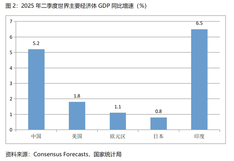 二季度5.2%的經(jīng)濟(jì)增速在世界上是比較快的增速。根據(jù)Consensus Forecasts 最新預(yù)測(cè)數(shù)據(jù),今年二季度美國GDP同比將增長1.8%,歐元區(qū)將增長1.1%,日本將增長0.8%,印度將增長6.5%,我國仍然是世界主要經(jīng)濟(jì)體中經(jīng)濟(jì)增長比較快的國家。