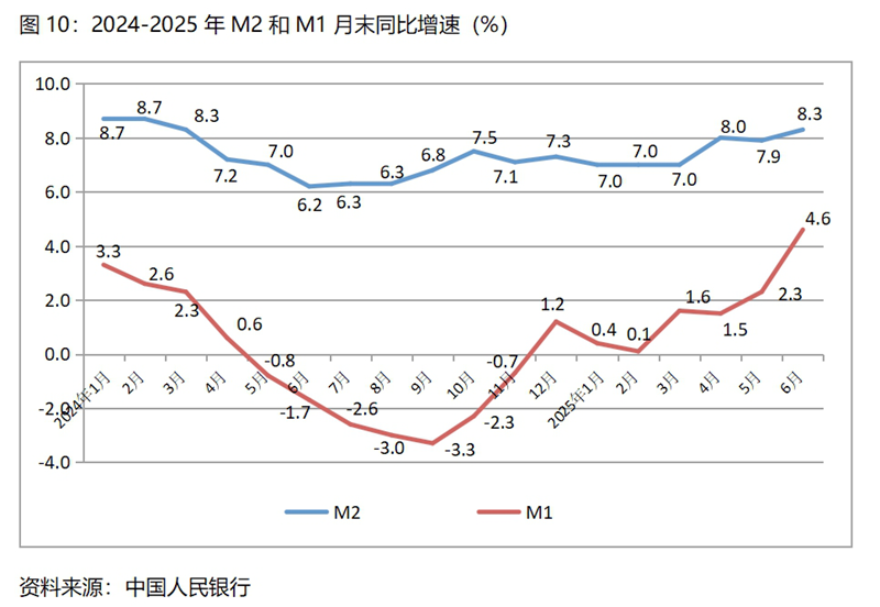 (五)廣義貨幣供應(yīng)量(M2)增速比一季度末和上年同期均保持回升,狹義貨幣供應(yīng)量(M1)增速比一季度末和上年同期也均保持回升。6月末,廣義貨幣供應(yīng)量同比增長8.3%,比一季度末增長7.0%回升了1.3個(gè)百分點(diǎn),比上年同期增長6.2%回升了2.1個(gè)百分點(diǎn),總體保持了今年以來持續(xù)回升的勢(shì)頭;6月末,狹義貨幣供應(yīng)量同比增長4.6%,比一季度末增長1.6%回升了3.0個(gè)百分點(diǎn),而上年同期為下降1.7%。說明今年以來的貨幣政策較好地堅(jiān)持了適度寬松的方向,為經(jīng)濟(jì)運(yùn)行提供了較為寬松的流動(dòng)性,但從微觀經(jīng)營主體活力不足和價(jià)格低位運(yùn)行看,貨幣政策還有進(jìn)一步寬松的必要。